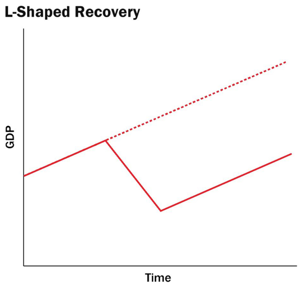 In an L-shaped recovery the economy recovers to a certain degree, but GDP potential growth does not reach pre-crisis levels for many years, if at all. This was the case following the Great Recession of 2008 when it took six years for GDP to return to 2007 levels.