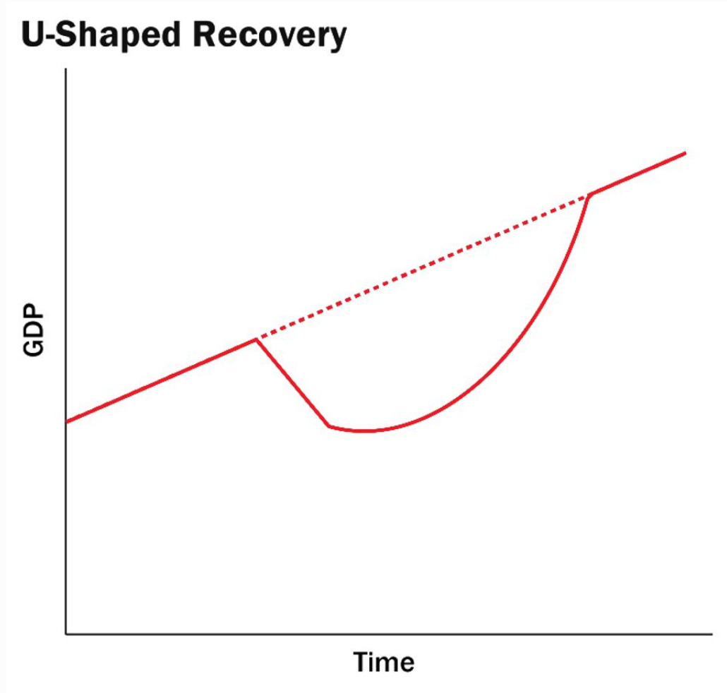 In a U shaped recovery the damage to the economy is more drawn out than in a V shaped recovery, but ultimately the economy does return to the pre-recession baseline level of growth.