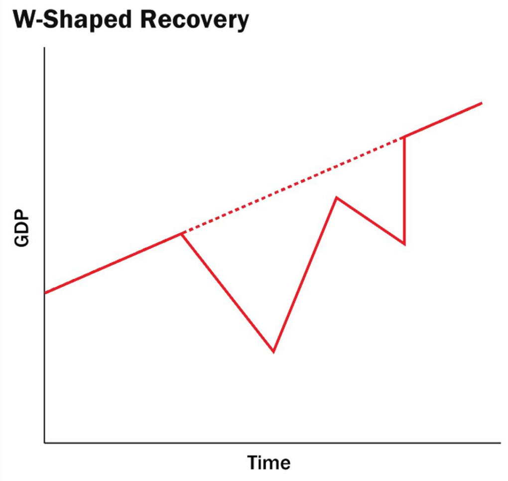 In a W shaped recovery the economy moves beyond a recession into a period of recovery before falling back into another recession. This is also known as a double dip recession. This scenario would make sense if there is a second wave of Covid-19 post recovery.
