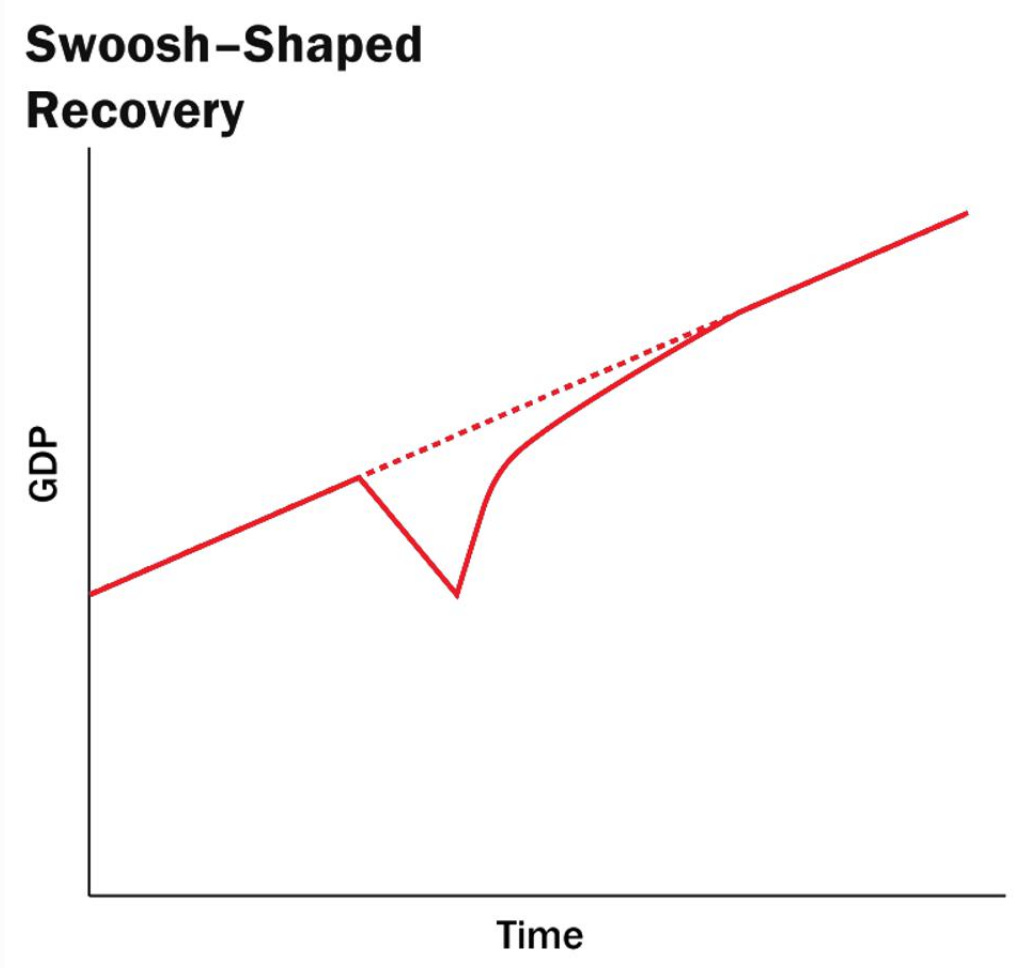In the “swoosh” scenario there is a steep drop followed by a very gradual recovery, it takes much longer to return to pre-crisis growth levels than it took to fall into the recession.