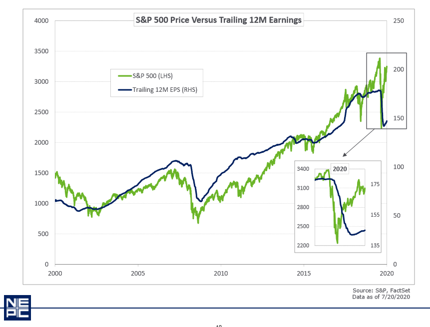 To frame the conversation I am including a chart from our investment consultants Don Stracke and Dan Hennessy of NEPC. The green line represents the stock market and the blue line represents trailing 12 month earning per share. Normally the two lines move together as you would expect, but since the Covid-19 pandemic they have decoupled.