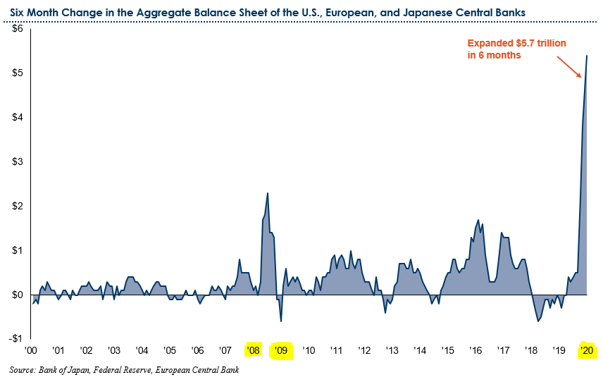 Below is another great chart from Payden & Rygel that illustrates the magnitude of the current QE programs by comparing them over rolling six month periods. When you see today’s actions versus the actions taken during the Great Financial Crisis of 2008/09 today looks like a Tsunami.